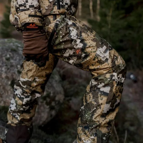 Swedteamin Ridge Pro -housut on valmistettu hiljaisesta materiaalista ja niissä on veden- ja tuulenpitävä COVERTEX®-kalvo. Housuissa on tuplataskut ja niissä on hiukan tiukempi istuvuus kuin Classic-malleissa. Housut sopivat useimpiin metsästystapahtumiin, mutta ovat parhaimmillaan aktiivisessa jahdissa.